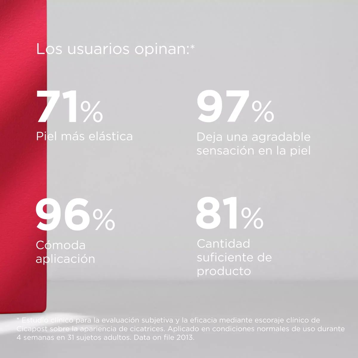 - Elasticidade: Sua fórmula com triterpenos de centella asiática e glicerina ajuda a melhorar a elasticidade e a aparência da cicatriz.