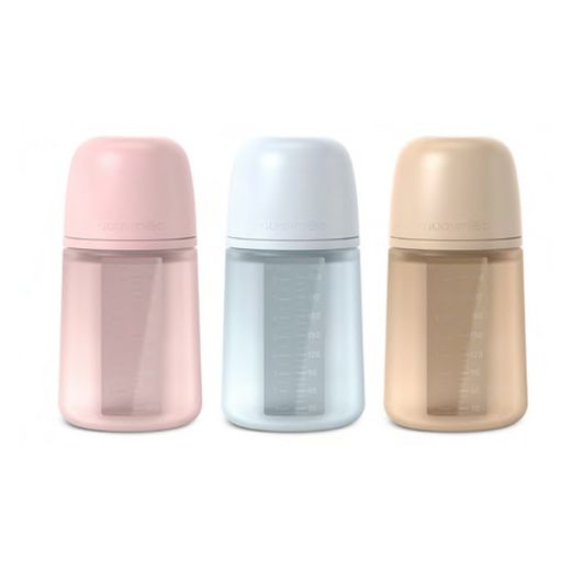 Frasco flexível e macio com toque aveludado que proporciona uma experiência sensorial única. Com tratamento de foto-oxidação que minimiza a adesão de fiapos e partículas de sujeira à garrafa. Pensando nos consumidores preocupados com os microplásticos, já que o leite/líquido não entra em contato com nenhuma parte plástica, apenas com o silicone.