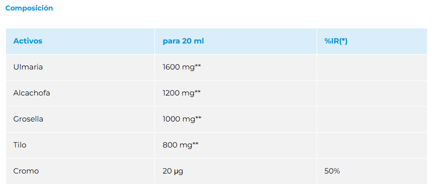 Ingredientes:Solução aquosa de oligoelementos (água filtrada, água do mar concentrada sem sódio, extrato padronizado de lithothamno – Phymatolithon calcareum Pall., gluconatos de zinco, ferro e cobre, cloreto de cromo, sulfato de manganês, selenito de sódio e molibdato), estabilizante: glicerina vegetal; Extratos de ulmária (Spiraea ulmaria L.), alcachofra (Cynara scolymus L.), groselha-preta (Ribes nigrum L.) e tília (Tilia cordata Mill.), aroma natural de pêssego, conservante: sorbato de potássio.