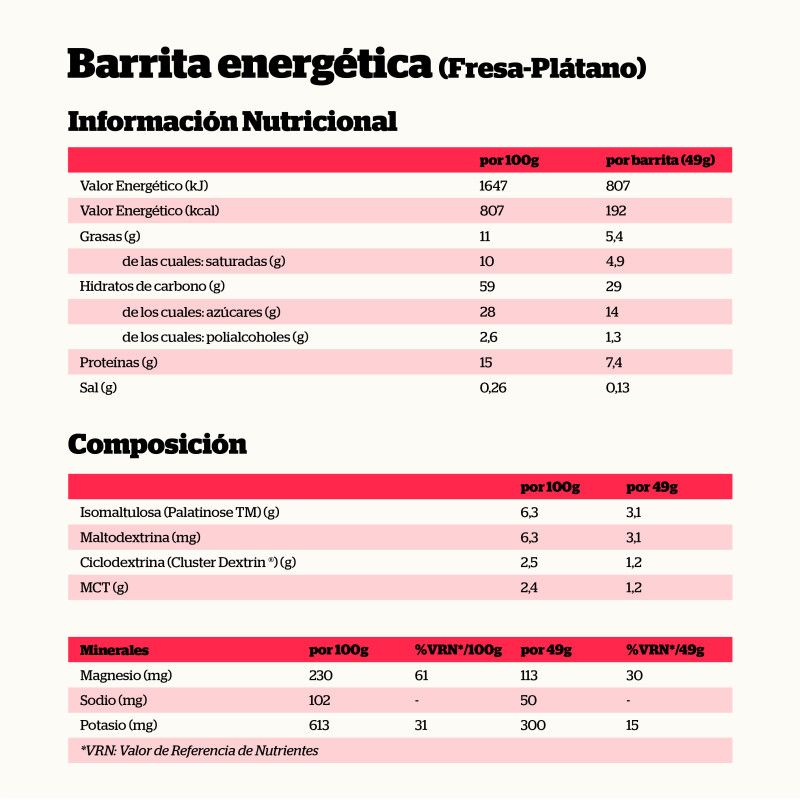 As Barras Energéticas NutriSport foram enriquecidas com magnésio, que ajuda a reduzir o cansaço e a fadiga, e com outros dois eletrólitos, sódio e potássio, que contribuem para o bom funcionamento dos nossos músculos e retardam a fadiga durante a atividade física. Por outro lado, foram reformulados para conseguir a melhor proporção de hidratos de carbono com assimilação rápida e sustentada para que tenha energia a curto, médio e longo prazo durante o seu treino ou competição. Para isso, foram incorporadas ciclodextrina ((Cluster Dextrin®) e isomaltulose (Palatinose TM), além de outras fontes energéticas como maltodextrina e MCT (triglicerídeos de cadeia média).