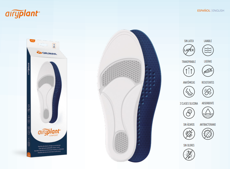 Palmilhas de alívio feitas com dois tipos diferentes de silicone: Um silicone em espuma muito leve e confortável forma o corpo da palmilha, combinado com um silicone macio e de menor densidade localizado nas áreas do metatarso e do calcanhar, promovendo alívio nos pontos de maior pressão e melhorando o conforto, tanto em posição parada quanto ao caminhar. Além disso, um acabamento superficial com esferas na base da palmilha proporciona um efeito de massagem para melhorar a circulação sanguínea.