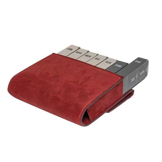 A caixa para comprimidos Velvet de grande formato, prática e elegante, é a companheira ideal para uma ótima organização diária. Esta caixa de comprimidos semanal combina funcionalidade e estética. A sua caixa é impermeável a manchas (como café ou chá) para que possa mantê-la impecável em todas as circunstâncias. Graças ao seu sistema magnético de abertura/fecho, a sua utilização é suave e descomplicada. Esta caixa de comprimidos diários distingue-se pelos seus módulos coloridos que diferenciam os dias de semana dos fins de semana. Cada módulo tem os 7 dias da semana impressos na lateral, enquanto as capas transparentes mostram os 4 horários do dia (MANHÃ, MEIO-DIA, TARDE, NOITE), correspondentes aos 4 compartimentos das caixas. As tampas possuem alças práticas nas extremidades, facilitando a abertura. Além disso, um fecho de segurança mantém os estojos firmemente no lugar. O Velvet Weekly Pill Organizer, disponível online e em farmácias selecionadas, oferece uma solução conveniente de armazenamento para seus medicamentos. O seu design elegante e a construção cuidada fazem dele um complemento essencial para a organização eficaz do seu tratamento. Este armário de remédios é maior que o clássico de veludo.