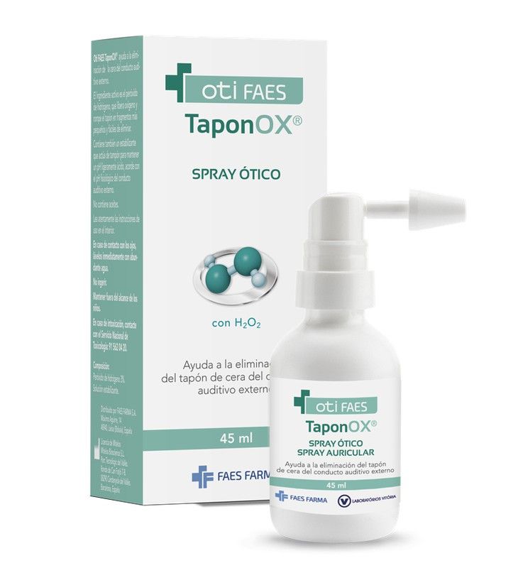 oti FAES TaponOX é um spray ótico que ajuda a quebrar o tampão de cera do conduto auditivo externo respeitando seu pH, evitando em alguns casos a necessidade de extração por um profissional. Além disso, oti FAES TaponOX mantém um pH ligeiramente ácido, semelhante ao pH do conduto auditivo externo, criando condições assépticas que impedem o crescimento bacteriano e o aparecimento de infecções como otite externa.